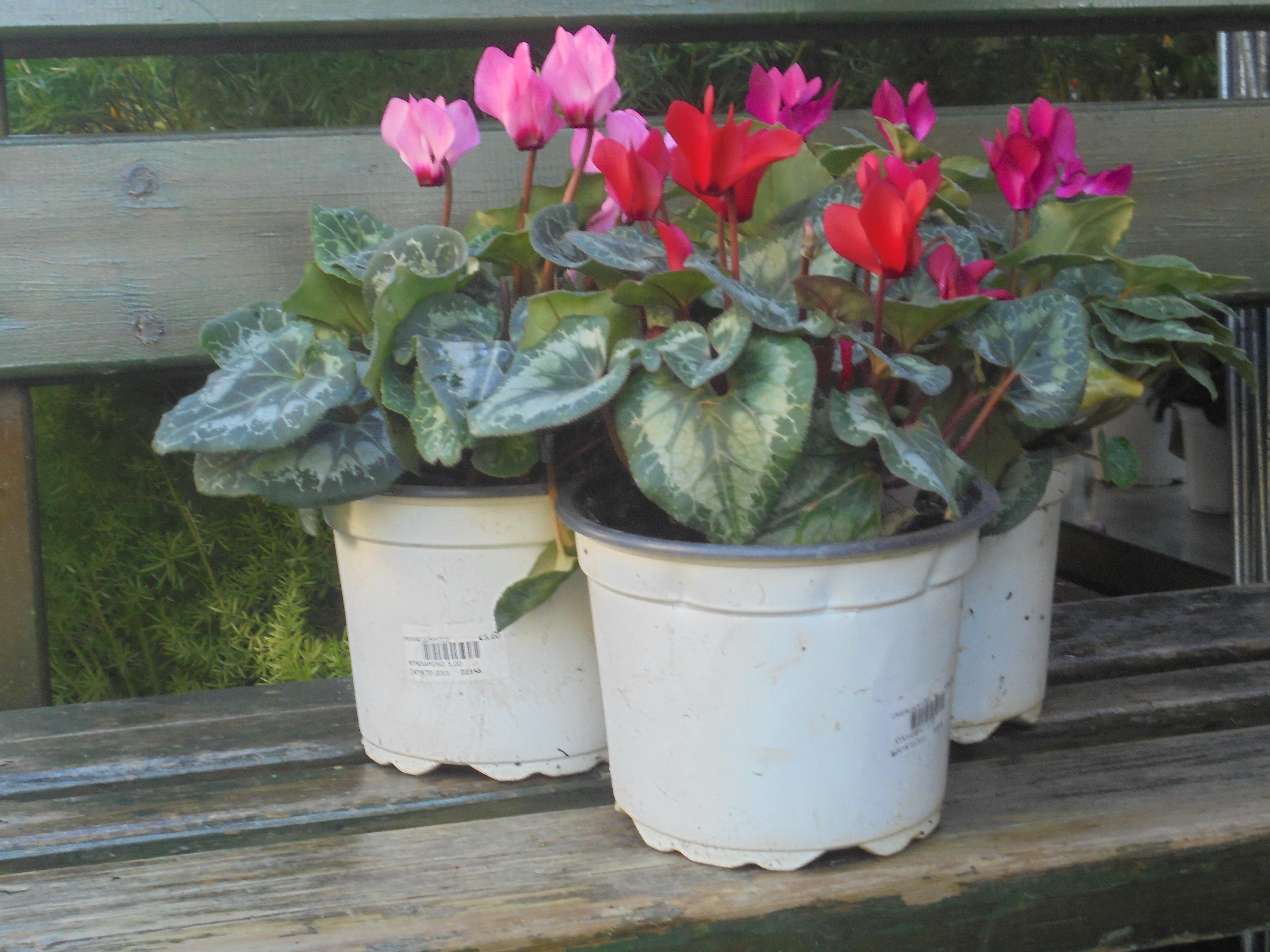 Bolbus plant,with large heart-shaped leaves flowering from early autumn until spring. Cyclamens are durable in winter's low temperatures up to -5°C. Its flowers can be white, red, pink etc. It needs filtered light but not intense sunlight that can burn its leaves.