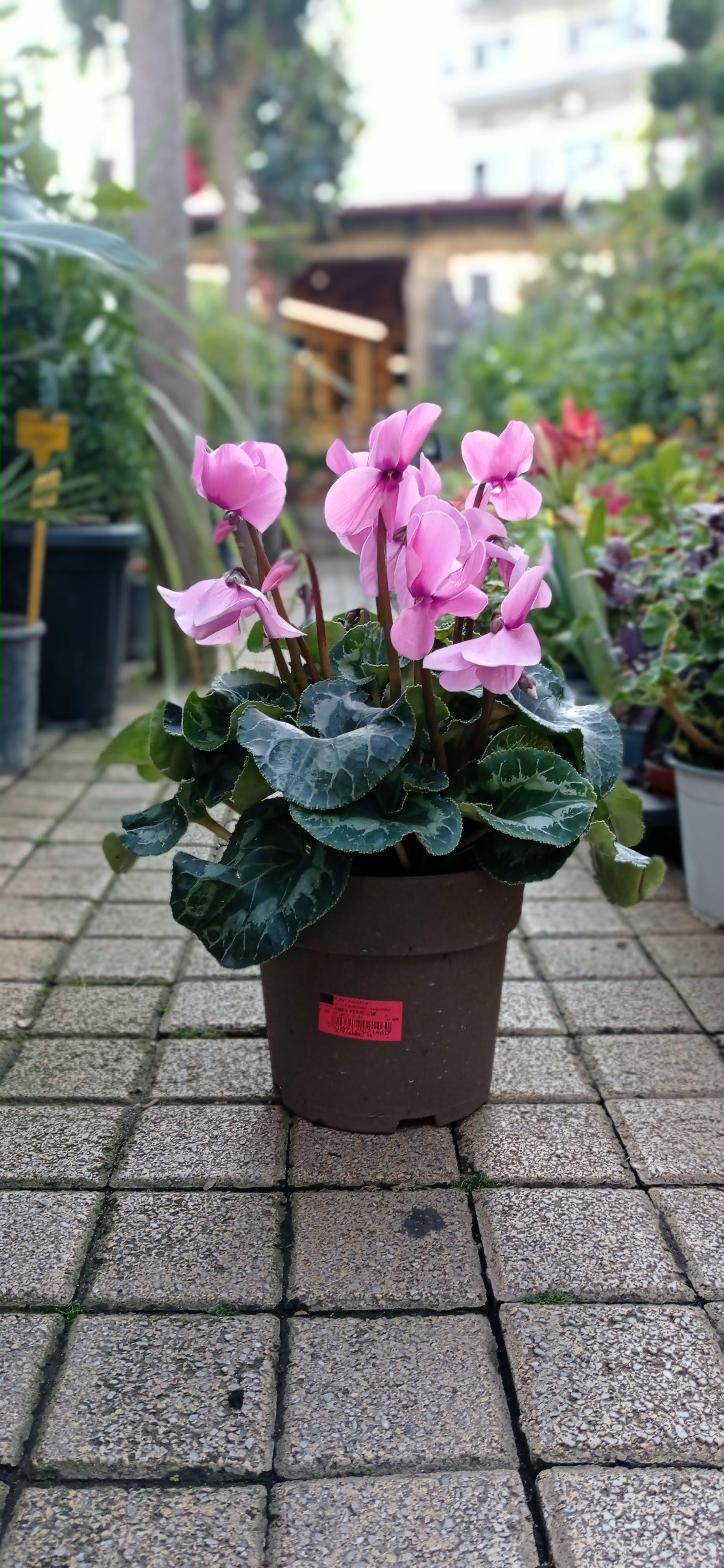 Bolbus plant, with large heart-shaped leaves, flowering from early autumn until spring. Cyclamens can withstand winter's low temperatures down to -5°C. Its flowers can be white, red, pink etc. It needs filtered light, but not intense sunlight, that can burn its leaves. It also needs enough moisture in order to grow properly. It can be planted in plates alone or in groups with other plants, as well as in small gardens.