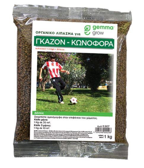 Το οργανικό λίπασμα για γκαζόν και κωνοφόρα της Gemma, είναι το ιδανικό για μία μακράς διάρκειας λίπανση. Εξασφαλίζει σταθερή, ομοιόμορφη ανάπτυξη και ισχυρό ριζικό σύστημα στο χλοοτάπητα ή τα φυτά σας. Παράλληλα, προσδίδει ανθεκτικότητα σε παθογόνους μύκητες. Εμπλουτισμένο με μαγνήσιο, το λίπασμα αυτό χαρίζει ένα όμορφο σκούρο πράσινο χρώμα στα φύλλα. Σύνθεση NPK 8-6-7 + 3MgO.