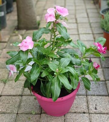 Αειθαλής θάμνος ή βοτανώδες φυτό.To ύψος του φτάνει 0,5μ.Φέρει γυαλιστερά πράσινα φύλλα.Τα όμορφα άνθη του είναι λευκά και σκούρο ρόζ με ένα σκουροκόκκινο κέντρο.Η Βίγκα-Δαφνούλα είναι ιδαίτερα ανθεκτική σε υψηλές θερμοκρασίες του καλοκαιριoύ και στην ξηρασία. Από την άλλη μεριά είναι ευαίσθητο φυτό στις χαμηλές θεροκρασίες του χειμώνα γι αυτό το λόγο και το φυτεύουμε εδώ στην Ελλάδα σαν ετήσιο.