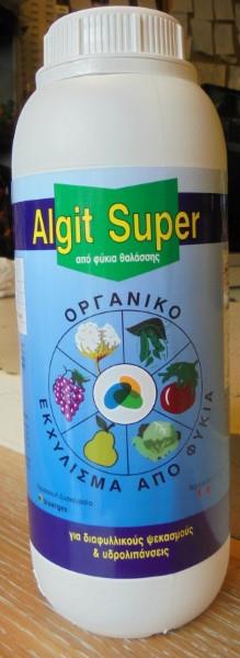 Το Algit-Super είναι ένα φυσικό προιόν που προκύπτει από αλκαλική υδρόλυση του θαλάσσιου φυκιού Ascophyllum Nodosum.Περιέχει πάνω από 60 κύρια και δευτερεύοντα θρεπτικά στοιχεία,πρωτείνες,υδατάνθρακες,αμινοξέα και διεγερτικά ανάπτυξης.Η σύνθεσή του είναι:προιόν φυκιών: 7,5%(60% οργανική ουσία) και δυαλύτες-αδρανή:92,5%.Συνδιάζεται με όλα τα συνήθη λιπάσματα και γεωργικά φάρμακα.Όλες οι ουσίες που περιέχει βρίσκονται σε φυσική και αρμονική σχέση με αποτέλεσμα να απορροφούνται πλήρως από τα φυτά είτε διαφυλλικώς είτε από τη ρίζα.