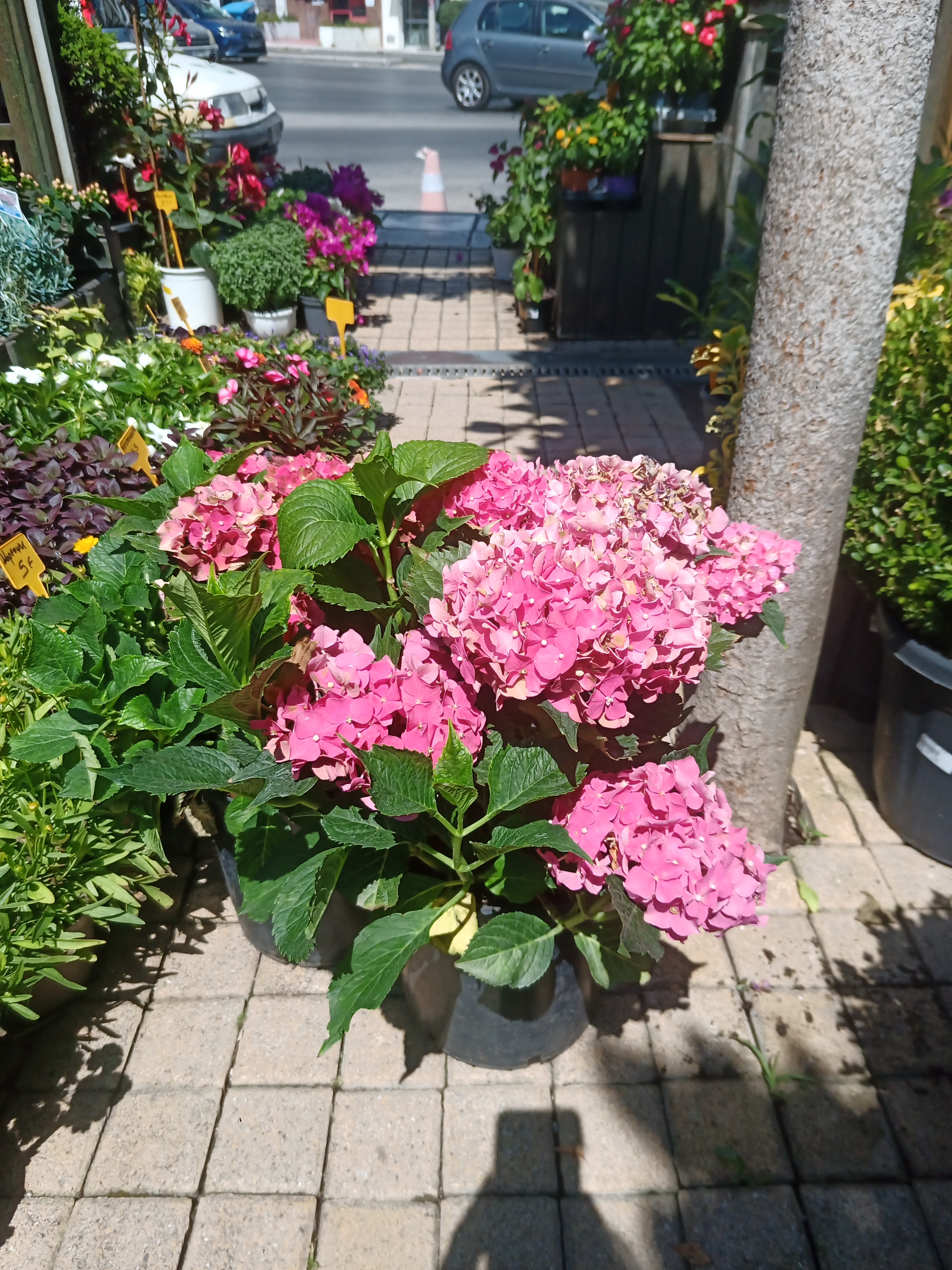 Φυλλοβόλος θάμνος που έχει ύψος 1-1,50m.Εχει σφαιρικό σχήμα και τα φύλλα της είναι μεγάλα και ανοιχτοπράσινα.Φέρει τεράστιες σφαιρικές ταξιανθίες σε διάφορα χρώματα όπως λευκό,μπλέ,ροζ και μοβ που ανθίζουν κατά τον Ιούνιο-Οκτώβριο ανάλογα με την ποικιλία.Απαιτεί πλούσια υγρά εδάφη και σκιερές ή ημισκιερές θέσεις.Φυτεύεται σε γλάστρες και κήπους.Αντέχει σε πολύ χαμηλές θερμοκρασίες από -15 εώς -20 βαθμούς.