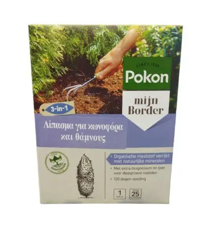 Ιδανικό Λίπασμα για Κωνοφόρα δέντρα και θάμνους ειδικά μελετημένο για να διατηρεί υγιή και λαμπερά τα φύλλα (βελόνες) τους.Βοηθάει τα δέντρα να αντιμετωπίσουν τις ασθένειες και τους φυσικούς εχθρούς.Επίσης μπορεί να εφαρμοστεί σε όλους τους θάμνους του κήπου σας.