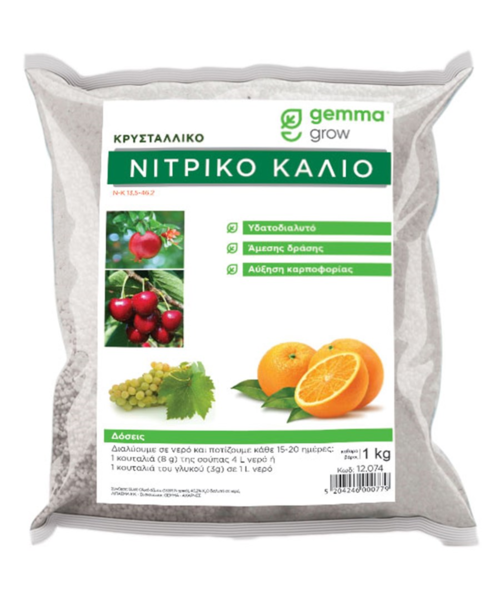 Το νιτρικό κάλιο διατηρεί την φυλλική επιφάνεια ζωηρή και πράσινη. Δίνει γεύση στους καρπούς και τους προσδίδει έντονο χρώμα. Για οπωροφόρα δένδρα και κηπευτικά στο στάδιο της συγκομιδής. Γενική δόση 2 g / L.