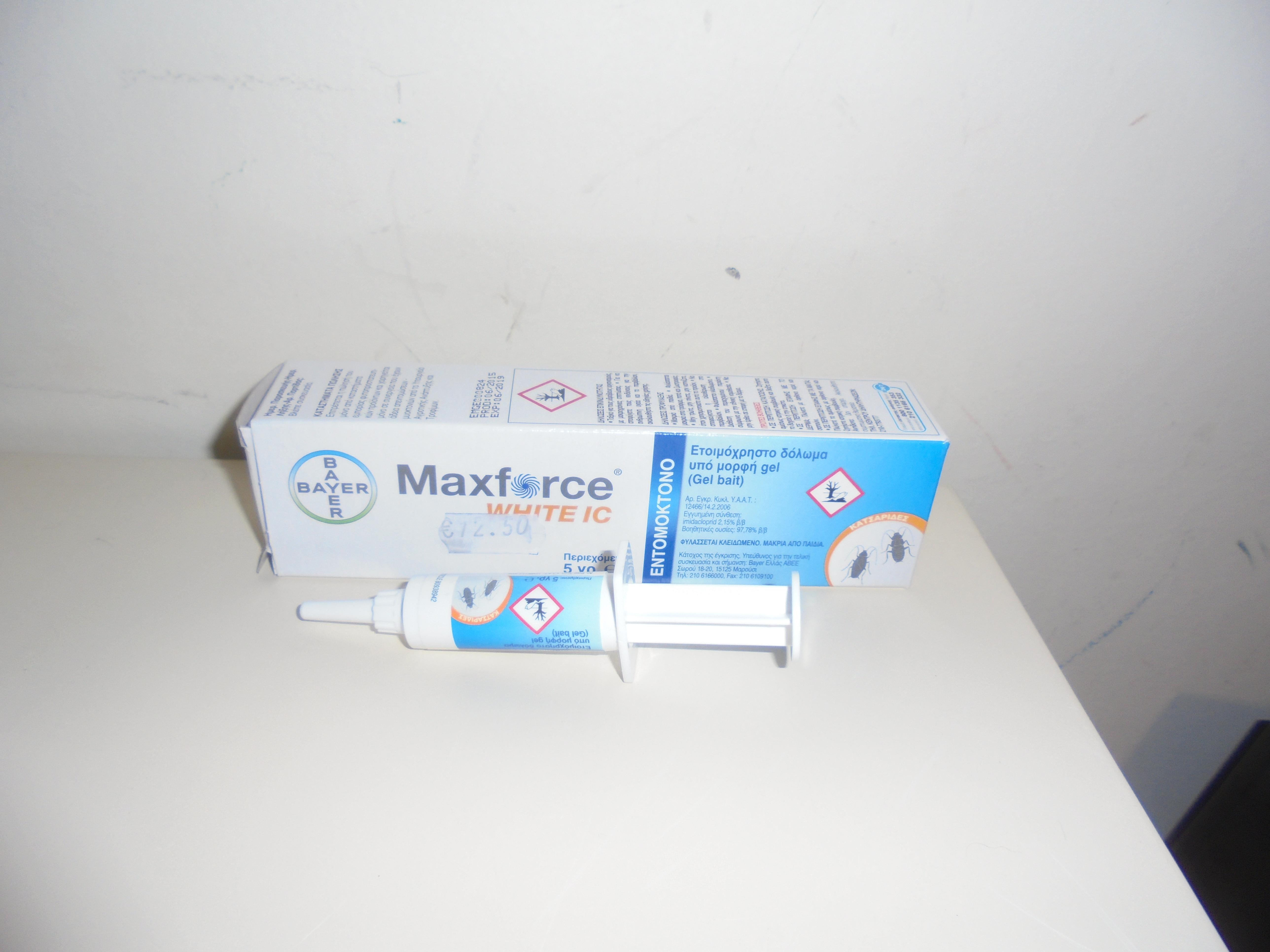 To Maxforce της Bayer είναι το δραστικότερο κατσαριδοκτόνο. Είναι σε συσκευασία σύριγγας και το διάλυμα του είναι σε μορφή ζελέ. Κατάλληλο για οικιακούς και επαγγελματικούς χώρους,σχολεία,εστιατόρια,ξενοδοχεία. Η δόση του είναι μία σταγόνα ζελέ ανά θέση δολώσεως ανά τ.μ. Το εφαρμόζουμε σε σημεία όπου είναι πέρασμα για τις κατασαρίδες, όπως μεντεσέδες, σωλήνες, κάτω από τις πόρτές και τα παράθυρα. Πάντα εφαμόζομαι το φάρμακο σε σημείο όπου δεν θα πλύνουμε ώστε να μην χάσει τη δράση του.