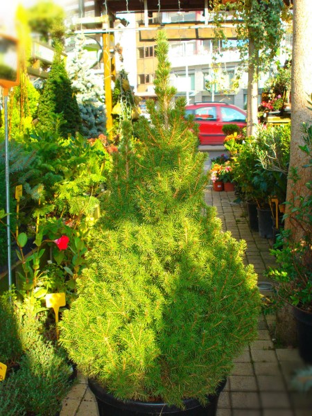 Κωνοφόρο φυτό με εμφάνιση συμμετρικής πυραμίδας και μέτρια ταχύτητα ανάπτυξης.Φτάνει σε ύψος 10-12m. και διάμετρο 5-6m.Φέρει ωραίο,γλαυκό,ελαφρά κατερχόμενο φύλλωμα και καστανοκόκκινους κρεμαστούς κώνους.Κατάλληλο για ηλιόλουστες περιοχές.Φυτεύεται σε μικρούς κήπους και γλάστρες.Αντέχει σε χαμηλές θερμοκρασίες και παγετούς εώς -15 με -25 βαθμούς.