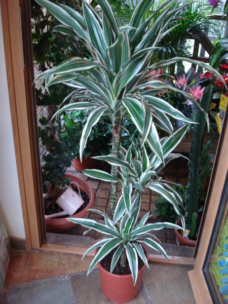 Dracaena with sword-like leaves with many white streaks, it can reach up height to 120-180 cm.Put Deremensis in bright filtered light, in early spring to autumn and in direct light in winter.Decorate your room with a Dracaena Deremensis at an empty space to highlight its curved leaves.It needs abundant watering and fertilizing with liquid fertilizer every two weeks during its development.To succseed good plant growth keep it in moisture.Dracaena oves heat, so the appropriate temperatures for its growth is 18-24 degrees Celsius.