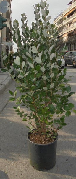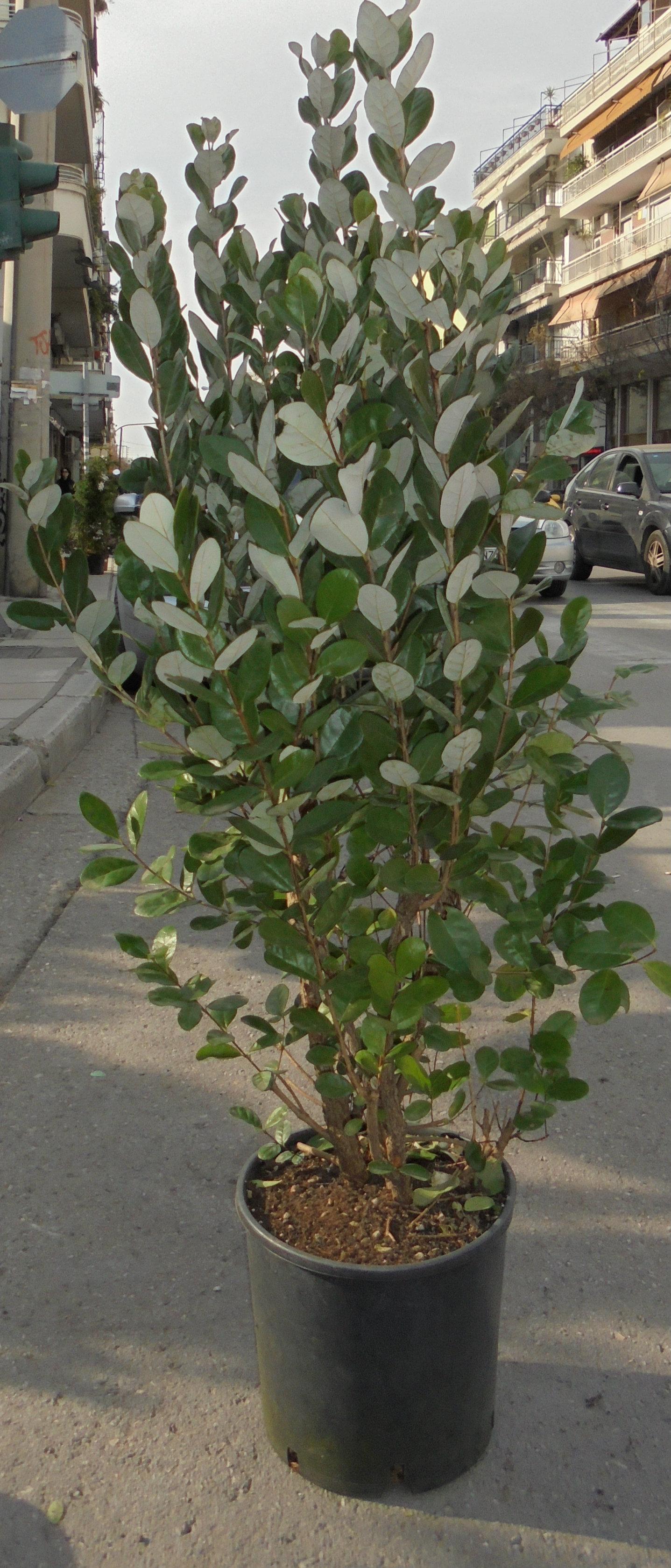 Upright evergreen shrub. Forming round leaves, green in the upper surface and the lower gray fluffy. Flowering July to August, with wonderful flowers composed of fleshy white petals and long red stamens. Autumn fruiting edible fruit, which give off a pleasant smell, like that of pineapple. Plant in sheltered positions sunward, while shen has claims to territorial recommendation. Is used single or in groups or clusters. Holds up to -6 / -12 degrees.