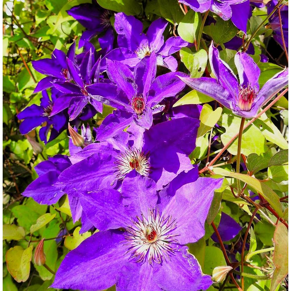 Climatis The President is a vigorous evergreen plant that thrives in areas with mild winters, while in regions with low winter temperatures it acts as deciduous. It has very lush and dense foliage, and its leaves have a lanceolate shape. At the ends of its branches, tendrils form that help it 'grasp' onto supports. It has a strong spread that can easily cover walls and fences. It can reach heights of 2 to 3 meters. Its shoots become woody at the end of summer, and after it drops its leaves, it gives the impression that the plant has dried out, but new growth emerges from the same branches in spring. CLimatis The President blooms in two phases, producing very impressive large purple flowers with pink anthers.The first blooming period is in late spring to early summer, and the second is from late summer to early autumn.