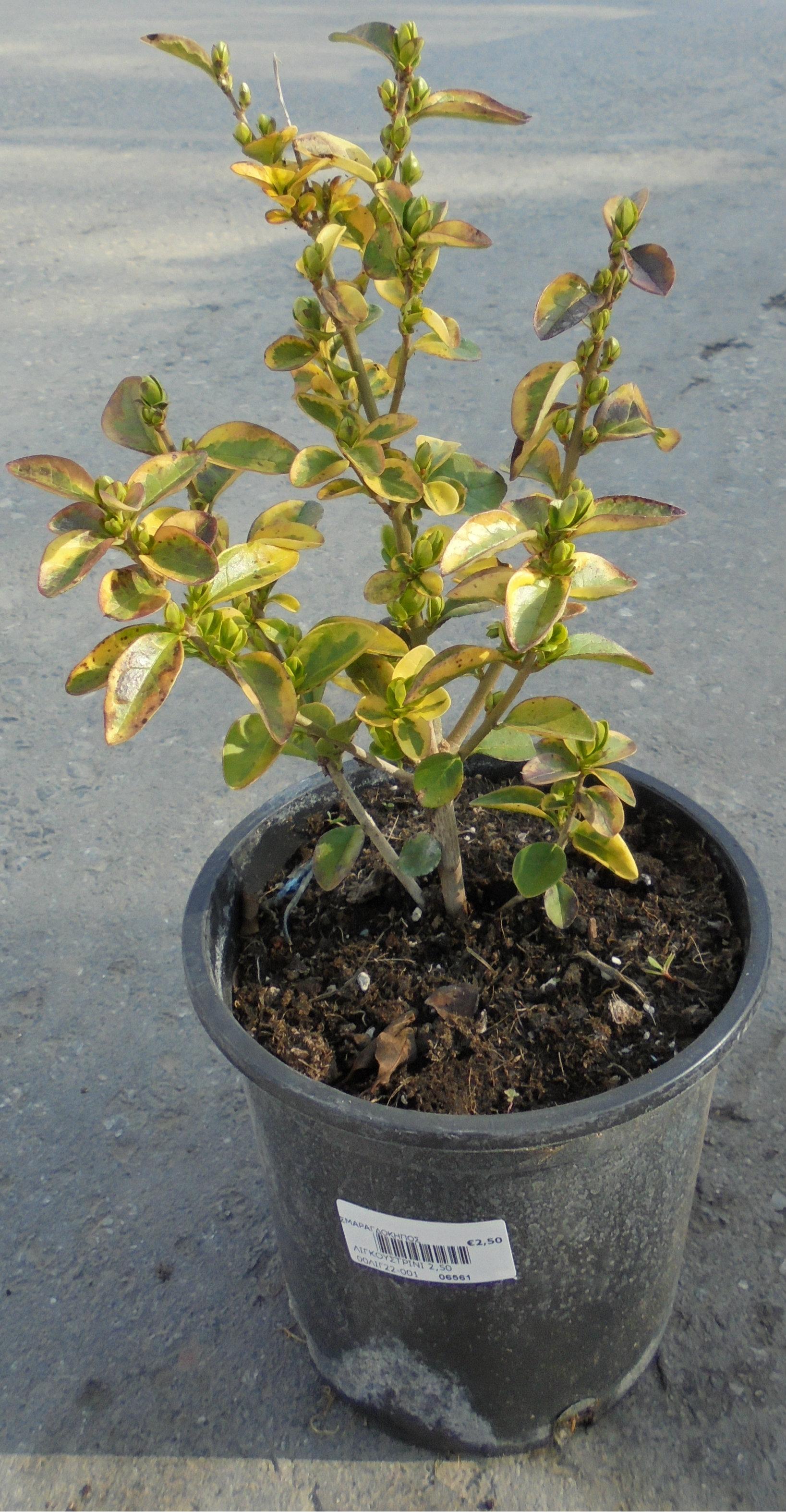 Semi-evergreen shrub with green foliage. Flowering in white foves at summer. Its leaves bear golden yellow edges or have yellow as their main color. High resistance at low temperatures. Suitable for medium hedges.
