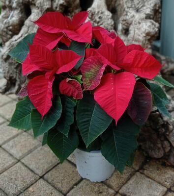 It is particularly well known for its red and green foliage and is widely used in Christmas floral displays.Euphorbia pulcherrima is a shrub or small tree, typically reaching a height of 0.6–4 metres.The plant bears dark green dentate leaves.The colored bracts,which are most often flaming red but can be orange, pale green, cream, pink, white, or marbled,are often mistaken for flower petals because of their groupings and colors, but are actually leaves. The colors of the bracts are created through photoperiodism, meaning that they require darkness (12 hours at a time for at least five days in a row) to change color. At the same time, the plants require abundant light during the day for the brightest color.Ιdeal temperature for Euphoria Pulcherrima is 15 to 25 dedrees of Celcious.
