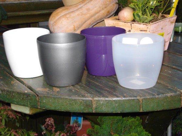 Cachepot Roto Brilllante of Plastona, diam.14cm. There is a total of 15 different colors, pink, fuschia, yellow, light green, brown, burgundy,turquoise, white, orange,clear for orchids and more.
