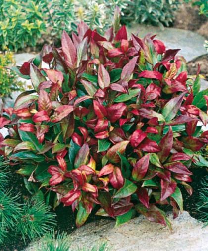 Evergreen shrub with dark green foliage with white edges and diffuse pink-red hues. May occur Democratic flowers in bunches. Plant in semi-shaded positions and serpent soils. It reaches a height and diameter of 1m and is suitable for rock gardens and Jardiniere in shady places.