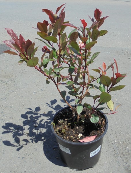 Evergreen shrub with upright shape. Initially the sprouts are bright red, then red to violet and finally became green. The sun and temperature depending affect the coloring of the leaves. Creme flowering umbrella canopy, April-May. Prefers cool soils and full or semi-shaded positions. Open regularly and intensely pruning. Identities seedling pyramid or tree. Suitable for individual or groups, clusters and free-formed or fences.
