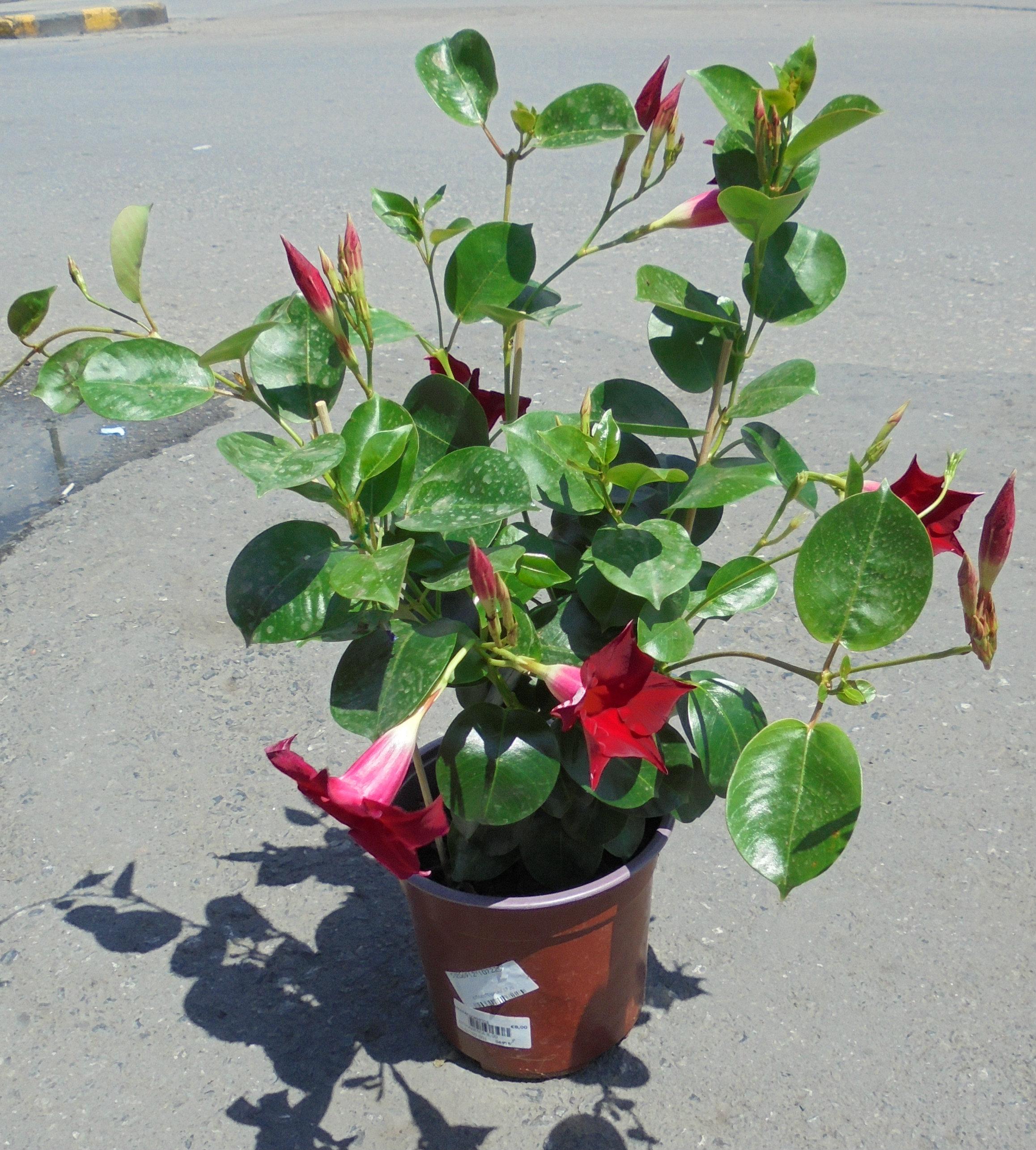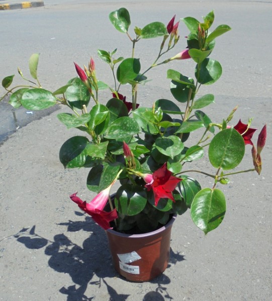 The Dipladenia or Brazilian Jasmine is a semi-vining plant with evergreen glossy foliage. It produces very impressive flowers 5-6cm. in colors such as white, red, yellow, and pink. It thrives in rich, light, permeable soils and sheltered positions. It withstands temperatures down to -2/-4 degrees. Suitable for semi-shady and sunny corners on your balcony.