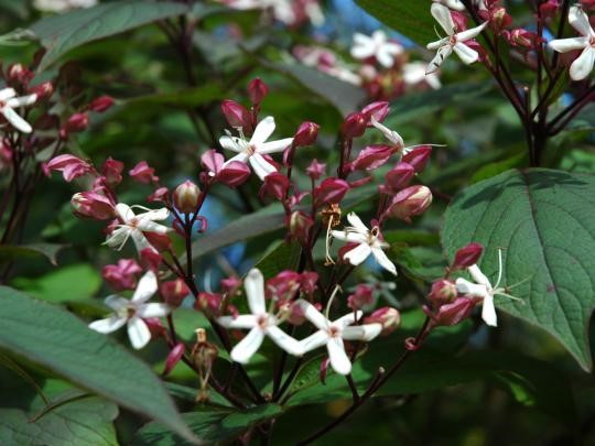 Upright deciduous species of climbing plant with broad oval leaves flying pronounced ribs. Flowering August to September, white, slightly aromatic corymb. In the center of the star-shaped, purple calyx formed blue fruits held from October to February. Plant in light and non-calcareous soils, in sunny and protected from freezing positions. Seen individually, in clusters and for hedges.