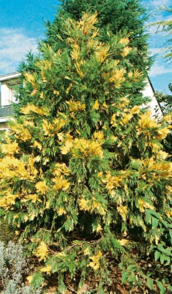Conifers shaped kolonoeides, moderate growth. Foliage with golden spots that give a special vitality garden, aromatic, with ramifications far closed. It is quite compact with a round top. Fyteftai individual, groups, fences. Withstands -20 / -30 degrees.