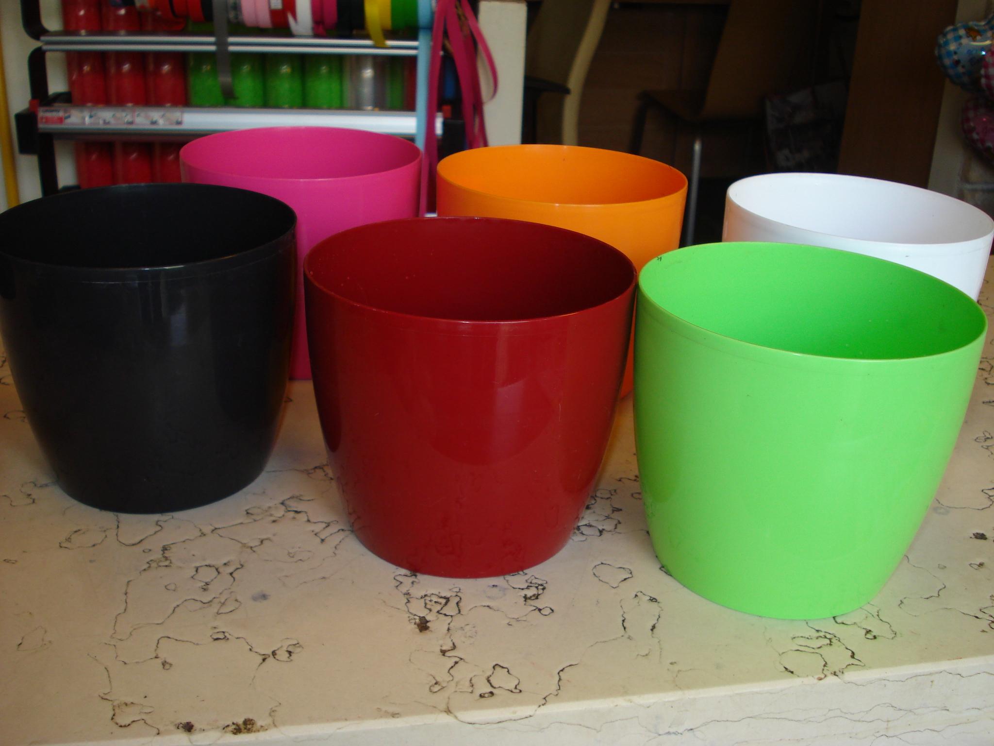 Pot plastic with glossy coating, very good quality and in sensitive.Diam. 14 and altitude. 12.Available in white colors, dark pink, lime, green, gkrena, anthracite, orange and chocolate.Recommend especially indoors where our difficult but made drainage holes are used as pots.