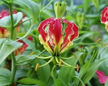 One of the most beautiful plants.The special charecteristic of Gloriosa is the remarkable beautiful and anknown blossom.It is a tuberous plant that reaches 1 or 2 metres height.If Gloriosa is kept in an inside and sunny place and is given to its ,often,liquid fertilyzer of flowering , it will blooms nearly every year.It doesn't need alo of water and do need drained soil.The suitable temperature for Gloriosa is from 17 to 25 degrees.Gloriosa can not survives on glacier.